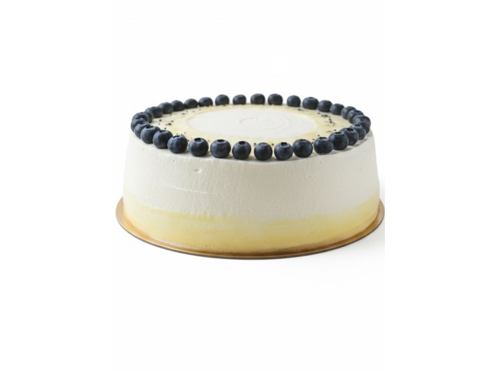 Světlý citronový korpus promazaný citonovým a borůvkovým krémem,čerstvé borůvky.