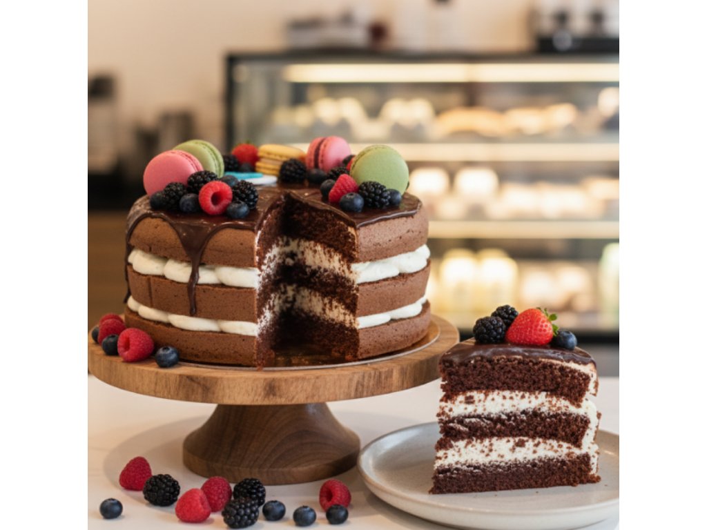 Čokoládový korpus naplněný krémem ze smetany a mascarpone,čokoládová poleva.Čerstvé ovoce a makronky.