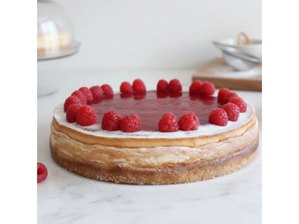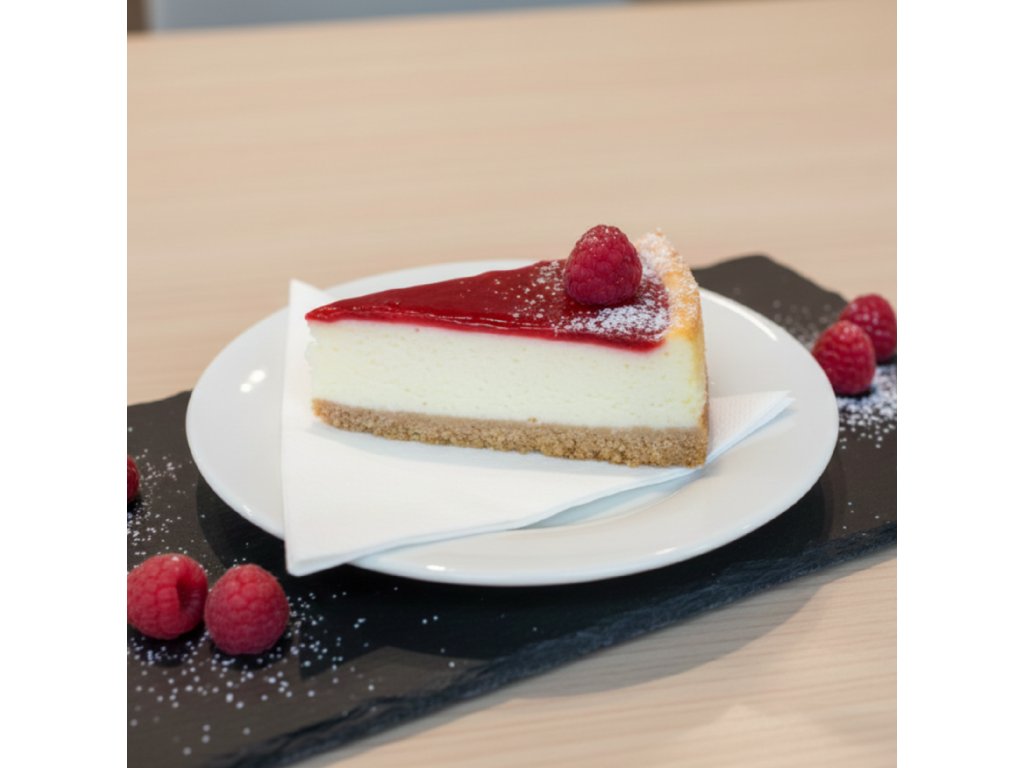 Korpus z máslových sušenek a másla,smetanový sýr ochucený vanilkou,malinový rozvar,čerstvé maliny.